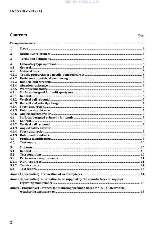 Keywords: EN 15330-2:2017, needle‑punched surfaces, sports surfaces, tennis courts, multi‑sport surfaces, shock absorption, vertical ball rebound, abrasion resistance, water permeability, CEN.