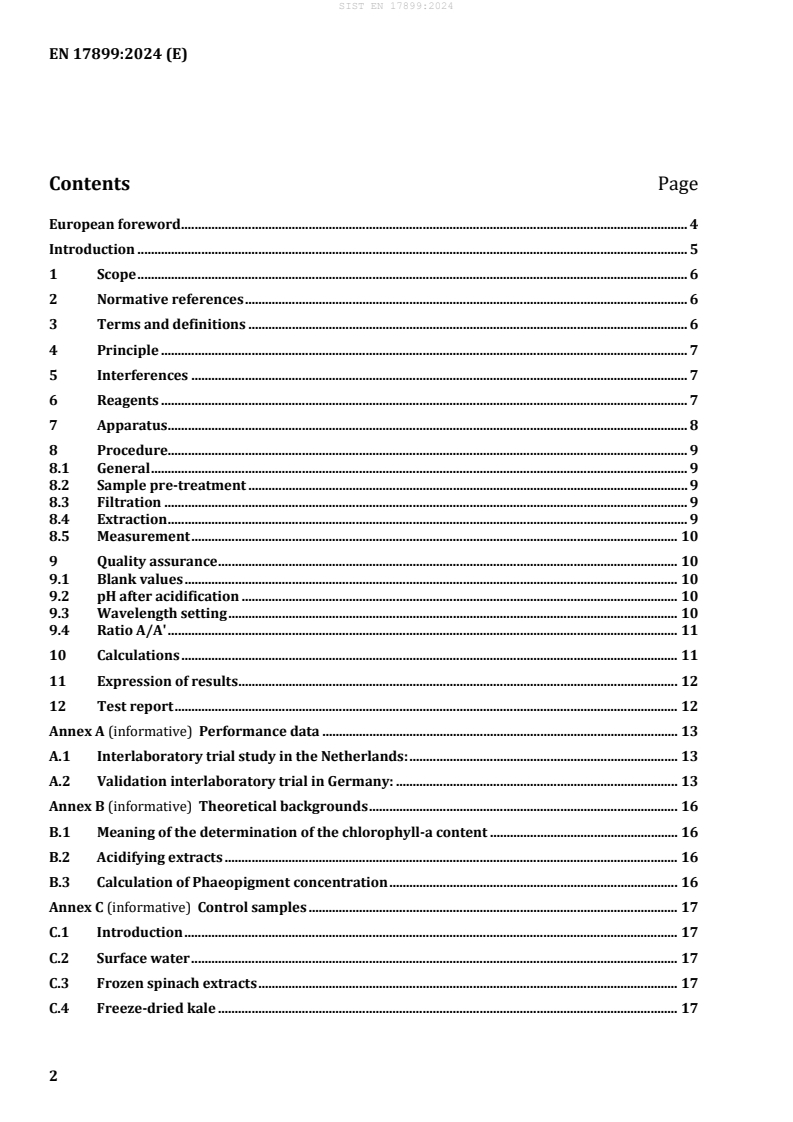 Keywords: EN 17899:2024, chlorophyll‑a, spectrophotometric determination, ethanol extraction, water quality, routine monitoring, CEN.
