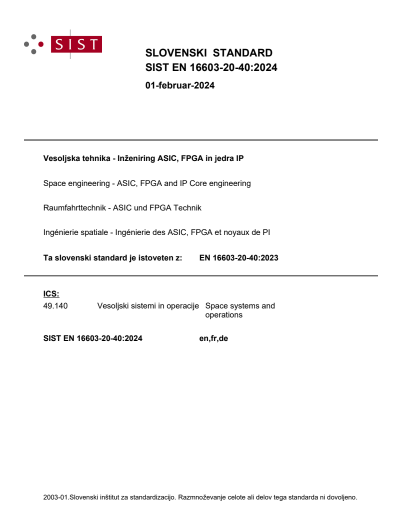 EN 16603-20-40:2023 is a standard published by the European Committee for Standardization (CEN). Its full title is "Space engineering - ASIC, FPGA and IP Core engineering". This standard covers: This activity w ill be the parallel development of EN 16603-20-40 and ECSS-E-ST-20-40C. The scope shall cover the areas of existing ASIC and FPGA engineering chapter 5 of ECSS-Q-ST-60-02C, but w ith w ider breadth and greater depth, covering engineering requirements of end-to-end development flow s, from specification of requirements to validation of prototypes, of the follow ing monolithic devices for its use in space: • ASICs (distinguishing digital, analogue and mixed-signal development flow s) • FPGAs (distinguishing three technology families: SRAM, FLASH and anti-fuse technologies) • ASIC and FPGA System-on-Chip embedding processor cores w hich have external “softw are programme” dependencies to be addressed during the SoC development, resulting in SW-HW co-design requirements.