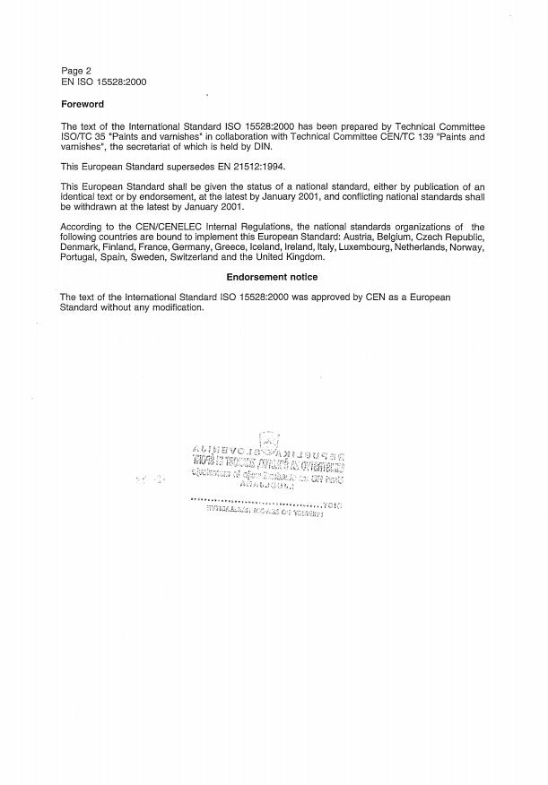 EN ISO 15528:2000 is a standard published by the European Committee for Standardization (CEN). Its full title is "Paints, varnishes and raw materials for paints and varnishes - Sampling (ISO 15528:2000)". This standard covers: This standard describes manual methods for sampling of paints, varnishes and raw materials for paints and varnishes. These include liquids and materials which, without undergoing chemical modification, are capable of being liquefied when heated up, and also powdered, granulated, and pasty materials. Samples may be taken from containers, e.g. cans, drums, tanks, containers, tank wagons of ships' tanks, as well as barrels, sacks, big-bags, silos or silo wagons, or from conveyor belts.