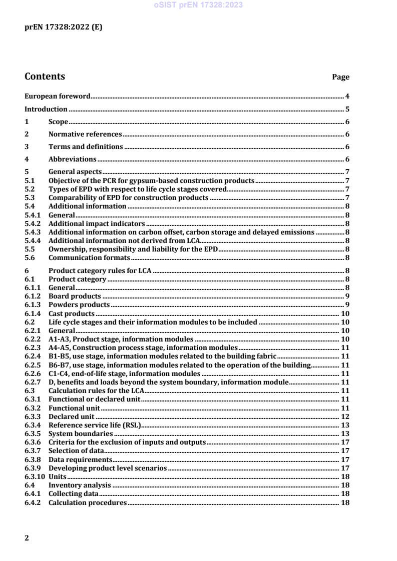 prEN 17328 is a draft published by the European Committee for Standardization (CEN). Its full title is "Complementary Product Category Rules for Gypsum-basedConstruction Products". This standard covers: This European standard provides the complementary product category rules (c-PCR) for Type III environmental declarations for gypsum-based products for the construction industry. In addition to the common parts of EN 15804, this European Standard for gypsum-based products: - specifies the functional and/or declared unit to be used; - defines the default system boundaries for gypsum-based construction products; - defines allocation procedures for the environmental impact of recycling and/or the use of by-products; - describes the default scenarios and rules for defining scenarios for each of the life cycle information modules A-D; - provides guidance for the determination of the reference service life (RSL) for gypsum-based construction products;