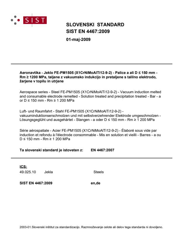 EN 4467:2007 is a European aerospace material standard that defines the requirements for steel FE-PM1505 (X1CrNiMoAlTi12-9-2) supplied as bar for aerospace applications. The standard covers chemical composition, melting and remelting methods, heat treatment (solution treated and precipitation treated), dimensional limits (bar a or D ≤ 150 mm) and mechanical properties, with a minimum tensile strength Rm ≥ 1 200 MPa. It is intended for use where high-strength, vacuum-refined stainless-type steel bars are required for aerospace components.