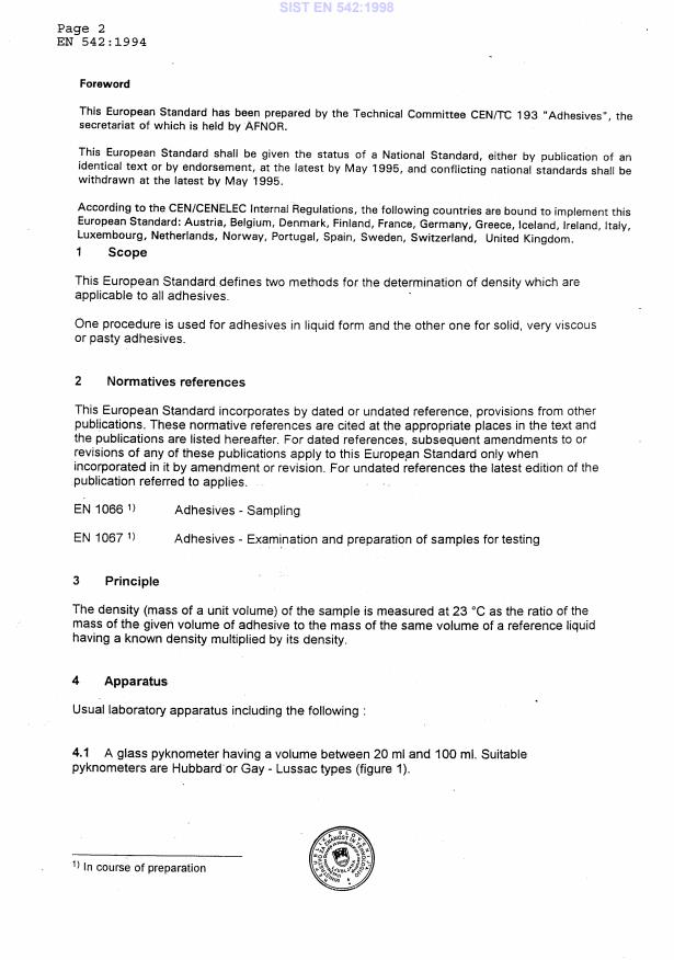 EN 542:1994 is a standard published by the European Committee for Standardization (CEN). Its full title is "Adhesives - Determination of density". This standard covers: This European Standard defines two methods for the determination of density which are applicable to all adhesives. One procedure is used for adhesives in liquid form and the other one for solid, very viscous or pasty adhesives.