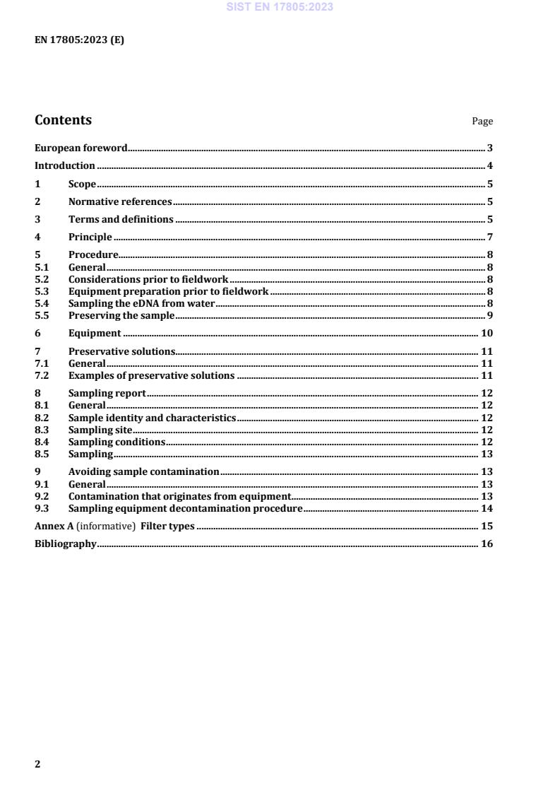 Vzorčenje vode za zajem okoljske DNK (eDNA) v vodnih okoljih. Okoljski DNK izvira iz organizmov, ki živijo ali so pred kratkim živeli v vodnem telesu, in ne vključuje okoljskega DNK, ki se nahaja v usedlinah ali podobnih vrstah vzorcev. Standard zajema postopke za preprečevanje kontaminacije vzorcev in zagotavljanje kakovosti DNK, ključne lastnosti postopka filtriranja in opreme ter standarde za poročanje.
