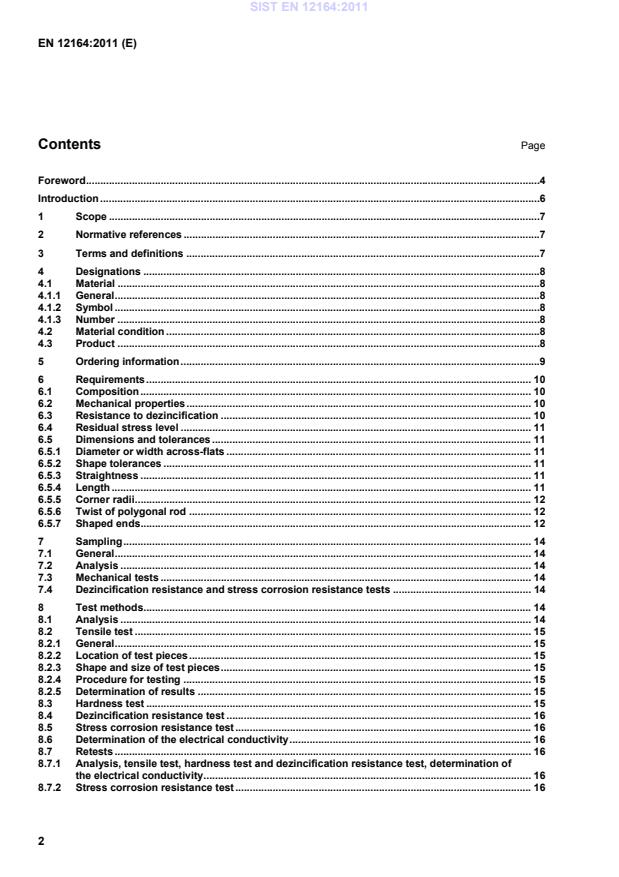 Rod — EN 12164 — CW614N — R500 — RND11,75A Denomination Number of this European Standard Material designation Material condition designation Cross-sectional shape, nominal cross-sectional dimension in millimetres, tolerance class 5 Ordering information In order to facilitate the enquiry, order and confirmation of order procedures between the purchaser and the supplier, the purchaser shall state on his enquiry and order the following information: a) quantity of product required (mass); b) denomination (Rod); c) number of this European Standard (EN 12164); d) material designation (see Tables 2 to 7); e) material condition designation (see 4.2 and Tables 8 to 13) if it is other than M; f) cross-sectional shape; g) nominal cross-sectional dimension (diameter or width across-flats); h) for round rod up to and including 30 mm diameter, whether Class A or Class B tolerances are required, unless the tolerance class is to be left to the discretion of the supplier (see Table 14); SIST EN 12164:2011