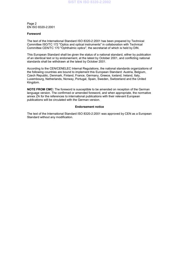 EN ISO 8320-2:2001 is classified under the following ICS (International Classification for Standards) categories: 11.040.70 - Ophthalmic equipment. The ICS classification helps identify the subject area and facilitates finding related standards.