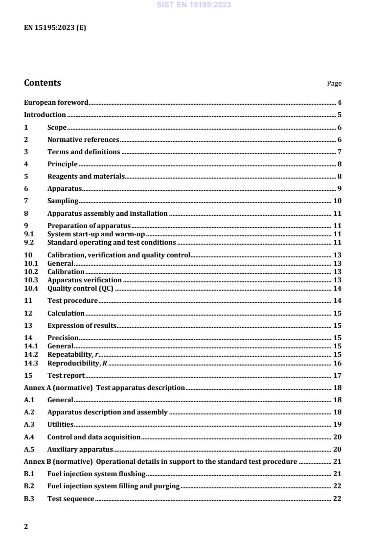 EN 15195:2023 (CEN) specifies a laboratory test method for measuring ignition delay of middle distillate fuels and for calculating the derived cetane number (DCN) using combustion in a constant volume combustion chamber. The method is intended for fuels used in compression-ignition (diesel) engines and provides a quantitative alternative to engine-based cetane testing. The standard covers ignition delays from 2.58 ms to 6.34 ms (equivalent to 76.8 DCN to 33.9 DCN). Measurement outside this range may be possible, but precision is not established.