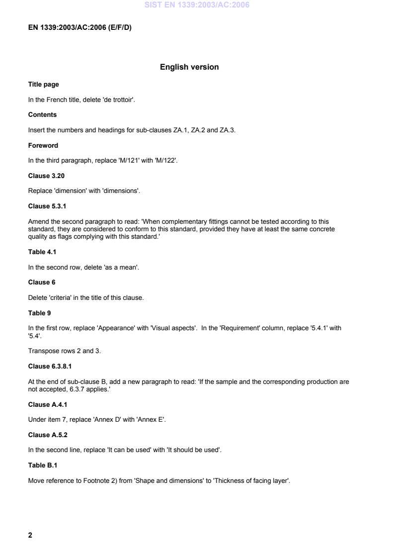 EN 1339:2003/AC:2006 is a corrigendum published by the European Committee for Standardization (CEN). Its full title is "Concrete paving flags - Requirements and test methods". This standard covers: TC - Various modifications throughout text
