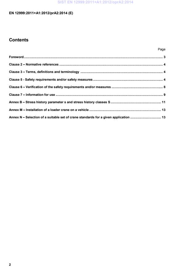 EN 12999:2011+A1:2012/FprA2:2016 is a draft published by the European Committee for Standardization (CEN). Its full title is "Cranes - Loader cranes". This standard covers: Definition of" loader crane" amended as decided by TC147/WG 1. Clause 5.3 amended to refer to EN 13001-3-1 in accordance with TC147 resolutions 244 and 245/2010. Clause 5.2.2.1 corrected for A2/B2 (see ISO/DIS 15442, clause 4.2.2.1).