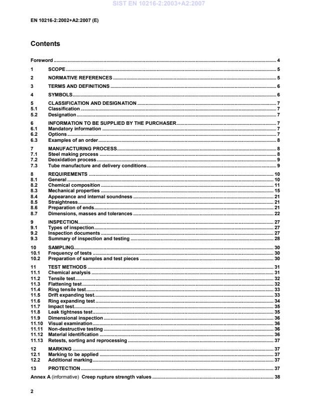 1 SCOPE This Part of EN 10216 specifies the technical delivery conditions in two test categories for seamless tubes of circular cross section, with specified elevated temperature properties, made of non-alloy and alloy steel. NOTE This Part of EN 10216 may also be applied for tubes of non-circular cross section; necessary modification should be agreed #at$ the time of enquiry and order. 2 NORMATIVE REFERENCES This European Standard incorporates by date or undated reference, provisions from other publications. These normative references are cited at the appropriate places in the text and the publications are listed hereafter. For date references, subsequent amendments to or revisions of, any of these publications apply to this European Standard only when incorporated in it by amendment or revision. For undated references the latest edition of the publication referred to applies (including amendments). The requirements of this European Standard rule when they differ from those in the standards and documents referred to below: EN 10002-1, Metallic materials - Tensile testing - Part 1: Method of test (at ambient temperature) EN 10002-5, Metallic materials - Tensile testing - Part 5: Method of testing (at elevated temperature) EN 10020, Definitions and classification of grades of steel EN 10021, General technical delivery requirements for steel and iron products EN 10027-1, Designation systems for steels - Part 1: Steel names, principle symbols EN 10027-2, Designation systems for steels - Part 2: Numerical systems EN 10045-1, Metallic materials - Charpy impact test - Part 1: Test method EN 10052, Vocabulary of heat treatment terms for ferrous products EN 10204, Metallic products - Types of inspection documents #EN 10220$, Seamless and welded steel tubes - Dimensions and masses per unit length EN 10233, Metallic materials - Tubes - Flattening test EN 10234, Metallic materials - Tubes - Drift expanding test EN 10236, Metallic materials - Tubes - Ring expanding test EN 10237, Metallic materials - Tubes - Ring tensile test EN 10246-1, Non-Destructive Testing of steel tubes - Part 1: Automatic electromagnetic testing of seamless and welded (except submerged arc welded) ferromagnetic steel tubes for verification of hydraulic leak-tightness EN 10246-5, Non-Destructive Testing of steel tubes - Part 5: Automatic full peripheral magnetic transducer/flux leakage testing of seamless and welded (except submerged arc-welded) ferromagnetic steel tubes for the detection of longitudinal imperfections EN 10246-6, Non-Destructive Testing of steel tubes - Part 6: Automatic full peripheral ultrasonic testing of seamless steel tubes for the detection of transverse imperfections SIST EN 10216-2:2003+A2:2007