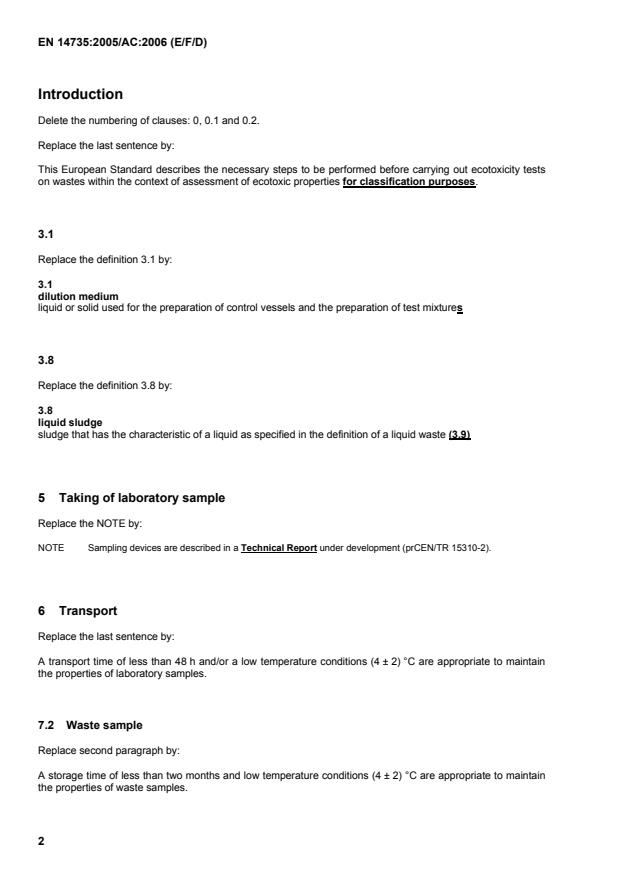 EN 14735:2005/AC:2006 is a corrigendum published by the European Committee for Standardization (CEN). Its full title is "Characterization of waste - Preparation of waste samples for ecotoxicity tests". This standard covers: Characterization of waste - Preparation of waste samples for ecotoxicity tests