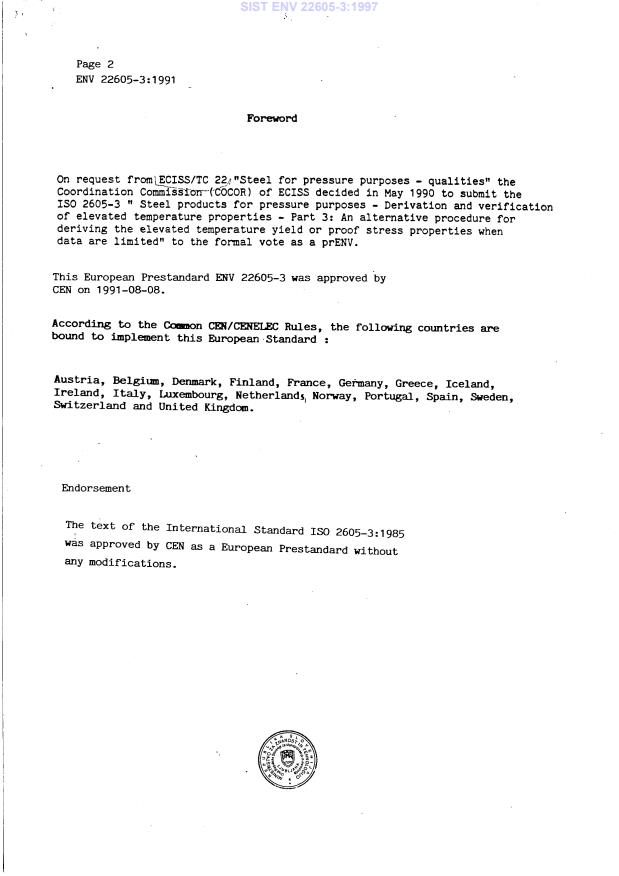 ENV 22605-3:1991 is a standard published by the European Committee for Standardization (CEN). Its full title is "Steel products for pressure purposes - Derivation and verification of elevated temperature properties - Part 3: An alternative procedure for deriving the elevated temperature yield or proof stress properties when data are limited (ISO 2605-3:1985)". This standard covers: This part of ISO 2605 defines an alternative to the method specified in ISO 2605/1 and ISO 2605/2, for deriving minimum elevated temperature tower yield stress or proof stress values for steel products for pressure purposes. It does not define a verification procedure; where verification of elevated temperature properties is required this shall be by hot testing until the requirements of ISO 2605/1 and ISO 2605/2 can be satisfied.