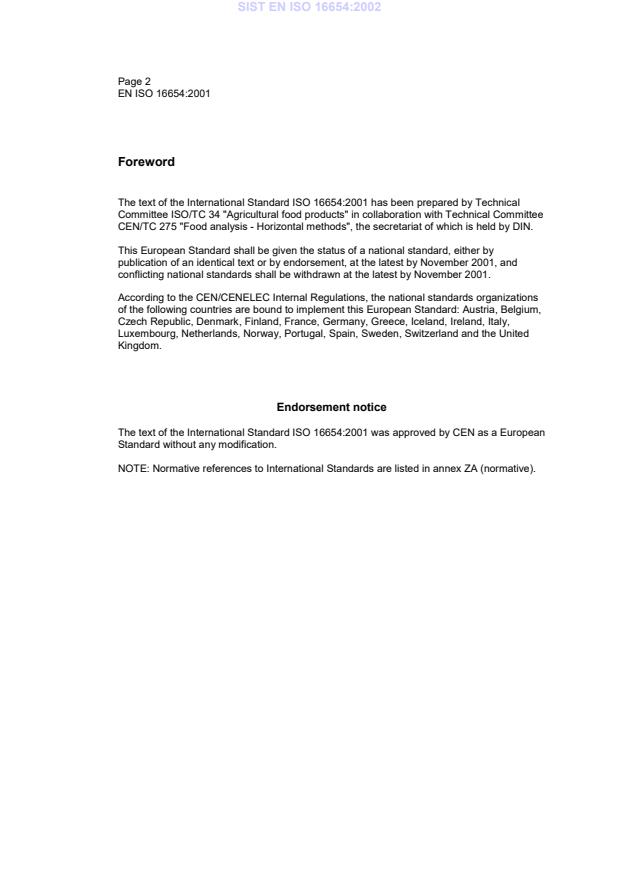 EN ISO 16654:2001 is classified under the following ICS (International Classification for Standards) categories: 07.100.30 - Food microbiology. The ICS classification helps identify the subject area and facilitates finding related standards.