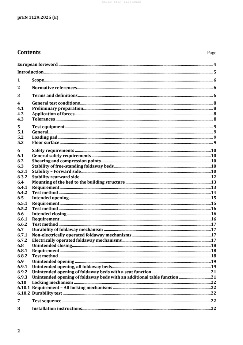 Keywords: foldaway beds, safety requirements, test methods, prEN 1129, CEN, durability tests, locking mechanism, stability, mounting, foldaway function.