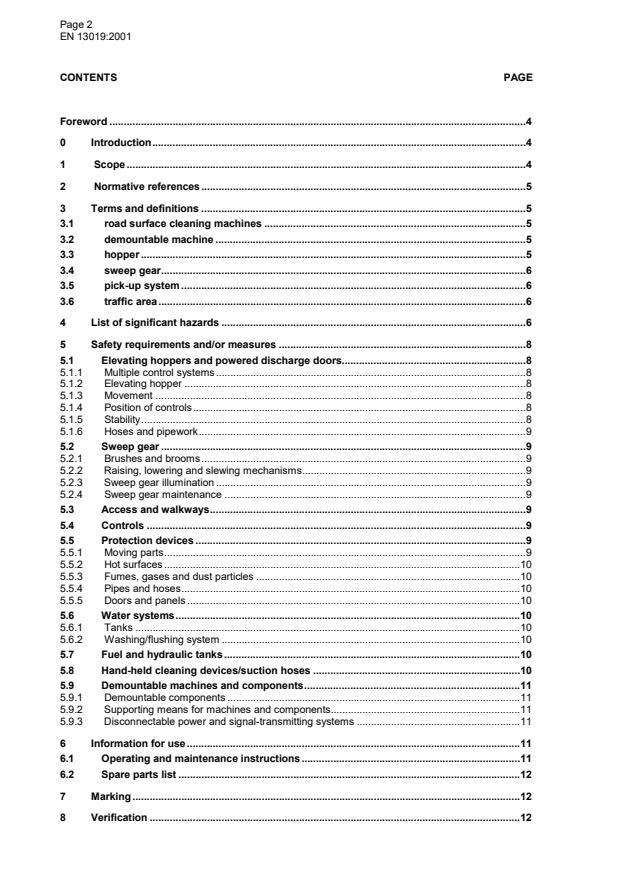 EN 13019:2001 is a standard published by the European Committee for Standardization (CEN). Its full title is "Machines for road surface cleaning - Safety requirements". This standard covers: This standard applies to road surface cleaning machines, which are defined in clause 3. The equipment would normally be mounted to a proprietary vehicular truck chassis or combined with its own chassis construction and propulsion system, in both cases to form an integral unit. Directives and standards for the vehicular truck chassis aspect, termed "Base Vehicles" in this standard, would be those relative to that equipment, even where specific modifications have been made to realise the road surface cleaning application.