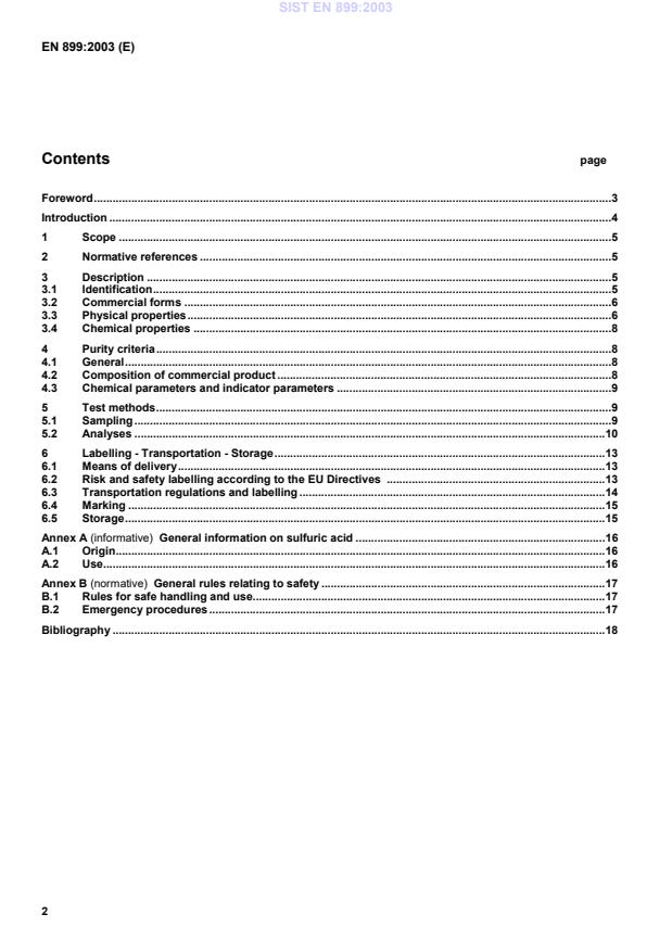 EN 899:2003 is a standard published by the European Committee for Standardization (CEN). Its full title is "Chemicals used for treatment of water intended for human consumption - Sulfuric acid". This standard covers: This European standard is applicable to sulfuric acid used for treatment of water intended for human consumption. It describes the characteristics of sulfuric acid and specifies the requirements and the corresponding test methods for sulfuric acid. It gives information on its use in water treatment. NOTE Conformity with the standard does not confer or imply acceptance or approval of the product in any of the Member States of the EU or EFTA. The use of the product covered by this European Standard is subject to regulation or control by National Authorities.