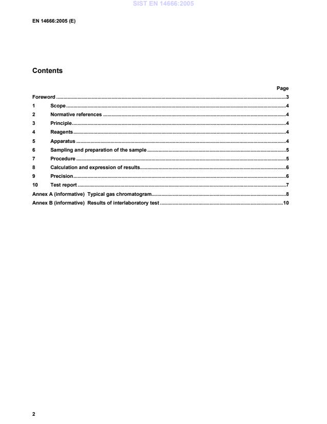 - Annex A: Example GC chromatogram and suggested operating conditions (carrier gas H2/He, injector ~250 °C, detector ~300 °C, injection ~1.5 µL, temperature program example included).