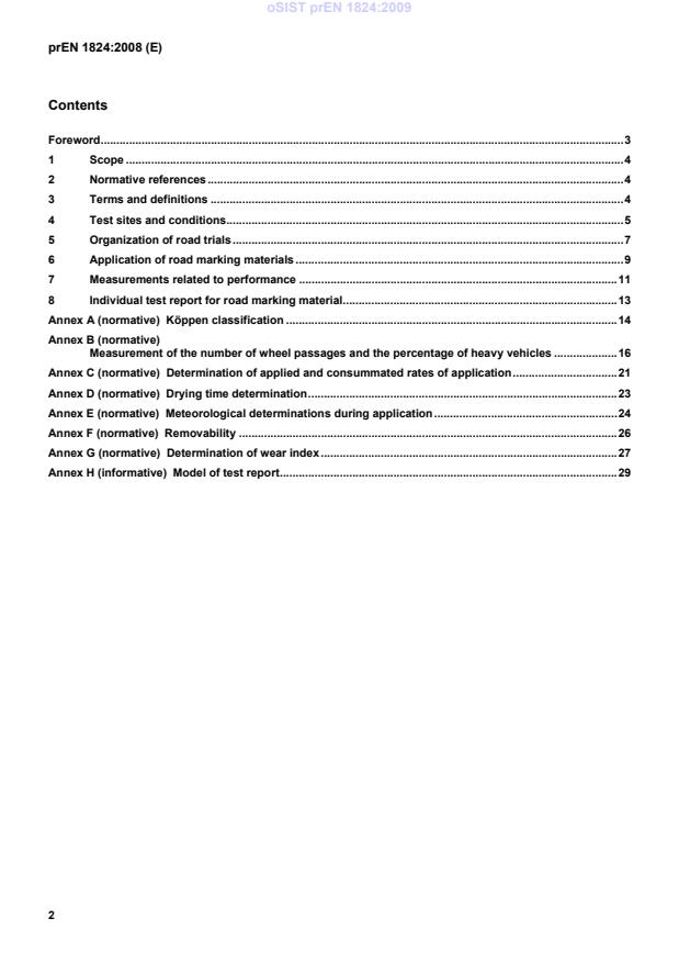 - Clause 7 defines performance-related measurements; annexes cover: wheel passage counting, application rate determination, drying time, meteorological monitoring during application, removability, wear index, and a model test report (Annexes B–H).