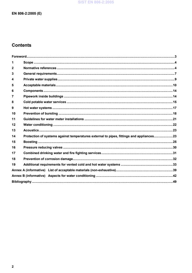 EN 806-2:2005 is a standard published by the European Committee for Standardization (CEN). Its full title is "Specification for installations inside buildings conveying water for human consumption - Part 2: Design". This standard covers: This document gives recommendations, and specifies requirements, on the design of potable water installations within buildings and for pipework outside buildings but within the premises (see EN 806-1) and applies to new installations, alterations and repairs.