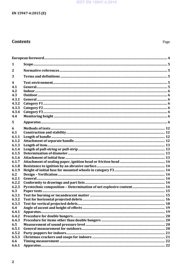 European foreword . 4 1 Scope . 5 2 Normative references . 5 3 Terms and definitions . 5 4 Test environment . 5 4.1 General . 5 4.2 Indoor . 6 4.3 Outdoor . 6 4.3.1 General . 6 4.3.2 Category F1 . 6 4.3.3 Category F2 . 6 4.3.4 Category F3 . 6 4.4 Monitoring height . 6 5 Apparatus . 6 6 Methods of tests . 12 6.1 Construction and stability . 12 6.1.1 Length of handle . 12 6.1.2 Attachment of separate handle . 12 6.1.3 Length of item . 13 6.1.4 Length of pull-string or pull-strip . 13 6.1.5 Determination of diameter . 13 6.1.6 Attachment of initial fuse . 13 6.1.7 Attachment of sealing paper, ignition head or friction head . 14 6.1.8 Resistance to ignition by an abrasive surface . 14 6.1.9 Height of initial fuse for mounted wheels in category F3 . 14 6.2 Design – Verification . 14 6.2.1 General . 14 6.2.2 Conformity to drawings and part lists . 14 6.2.3 Pyrotechnic composition
