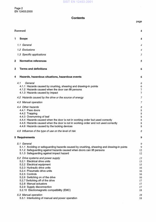 1.1 General This standard specifies the performance requirements in regard of the safety in use for any type of power operated doors, gates and barriers intended for installation in areas in the reach of persons, and for which the main intended uses are giving safe access for goods and vehicles accompanied or driven by persons in industrial, commercial or residential premises. 1.2 Exclusions It does not apply to - lock gates and dock gates; - doors on lifts; - doors on vehicles; - armoured doors; - doors mainly for the retention of animals; - theatre textile curtains; - horizontally moving doors < 2,5 m wide and 6,25 m² area, designed principally for pedestrian use; - revolving doors of any size; - doors outside the reach of people (such as crane gantry fences); - railway barriers; - barriers used solely for vehicles. 1.3 Specific applications Doors, gates and barriers can be of sliding, sidefolding, tilting, pivoting, rolling, vertical lifting and other types with many variances for each type. If not specified otherwise, the word "door" refers to any of these types and variances of doors, gates and barriers. In the following, a power-operated door is considered as a whole. Nevertheless such a door can be the result of the implementation of a drive unit onto a manual door. In that case, this standard is applicable for the completed final installation. Requirements for specific characteristics (such as fire resistance, blast-resistance, acoustic, escape route function, burglar resistance or thermal insulation, etc.) which certain doors are required to comply with, are notspecified in this standard. If the specifications of a standard on the special characteristics of such doors are in conflict with the requirements of this standard, that standard has preference.