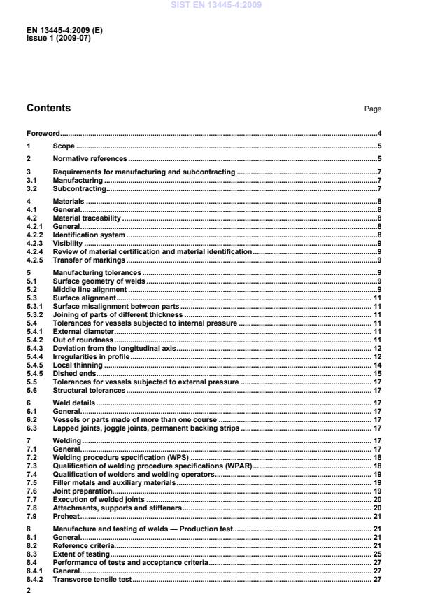 2 Normative references This Europe Standard incorporates by dated or undated reference, provisions from other publications. These normative references are cited at the appropriate places in the text and the publications are listed hereafter. For dated references, subsequent amendments to or revisions of any of these publications apply to this Europe Standard only when incorporated in it by amendment or revision. For undated references the latest edition of the publication referred to applies (including amendments). EN 287-1:2004, EN 287-1:2004/A2:2006, Approval testing of welders — Fusion welding — Part 1: Steels. EN 875:1995, Destructive tests on welds in metallic materials — Impact tests — Test specimen location, notch orientation and examination. EN 876:1995, Destructive tests on welds in metallic materials — Longitudinal tensile test on weld metal in fusion welded joints. EN 895:1995, Destructive tests on welds in metallic materials — Transverse tensile test. EN 910:1996, Destructive tests on welds in metallic materials — Bend tests. EN 1043-1:1995, Destructive tests on welds in metallic materials — Hardness testing — Part 1: Hardness test on arc welded joints. EN 1321:1996, Destructive tests on welds in metallic materials — Macroscopic and microscopic examination of welds. EN 1418:1997, Welding personnel — Approval testing of welding operators for fusion welding and resistance weld setters for fully mechanized and automatic welding of metallic materials. EN 10028-2:2003, Flat products made of steels for pressure purposes — Part 2: Non-alloy and alloy steels with specified elevated temperature properties. EN 10028-3:2003, Flat products made of steels for pressure purposes — Part 3: Weldable fine grain steels, normalized. EN 10028-4:2003, Flat products made of steels for pressure purposes — Part 4: Nickel alloy steels with specified low temperature properties. EN 10216-1:2002, EN 10216-1:2002/A1:2004, Seamless steel tubes for pressure purposes — Technical delivery conditions — Part 1: Non-alloy steel tubes with specified room temperature properties. EN 10216-2:2002+A2:2007, Seamless steel tubes for pressure purposes — Technical delivery conditions — Part 2: Non-alloy and alloy steel tubes with specified elevated temperature properties. SIST EN 13445-4:2009