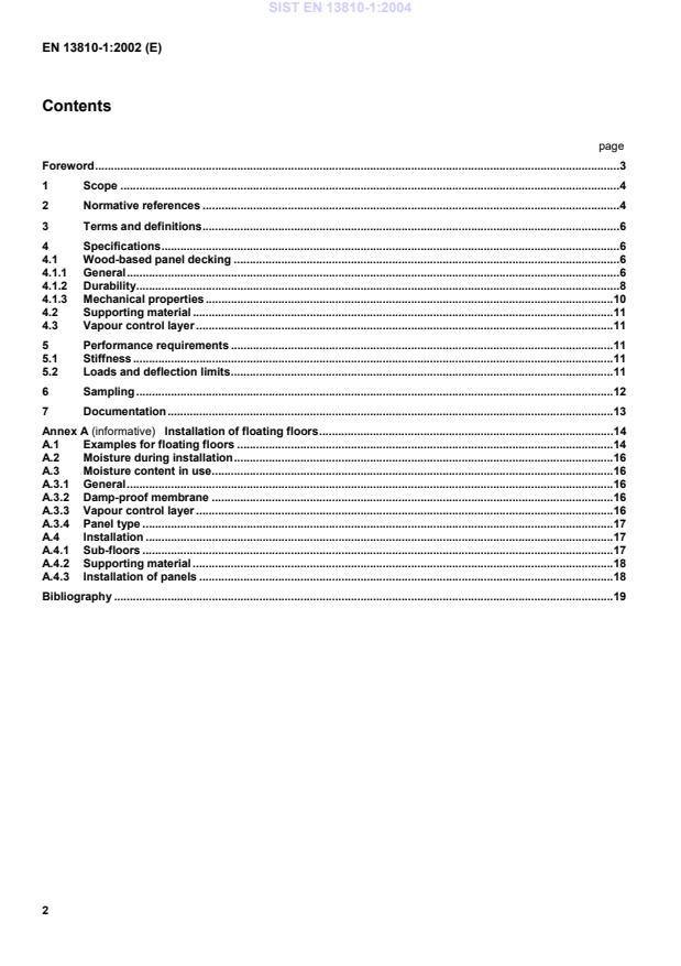 Installation of floating floors.14A.1Examples for floating floors.14A.2Moisture during installation.16A.3Moisture content in use.16A.3.1General.16A.3.2Damp-proof membrane.16A.3.3Vapour control layer.16A.3.4Panel type.17A.4Installation.17A.4.1Sub-floors.17A.4.2Supporting material.18A.4.3Installation of panels.18Bibliography.19SIST EN 13810-1:2004