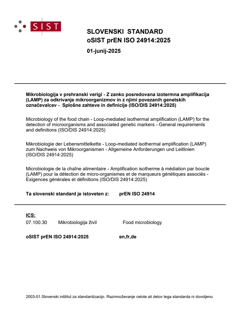 Mikrobiologija v prehranski verigi - Z zanko posredovana izotermna amplifikacija (LAMP) za ugotavljanje prisotnosti mikroorganizmov in njim pripadajočih genetskih označevalcev - Splošne zahteve in definicije (ISO 24914:2026)