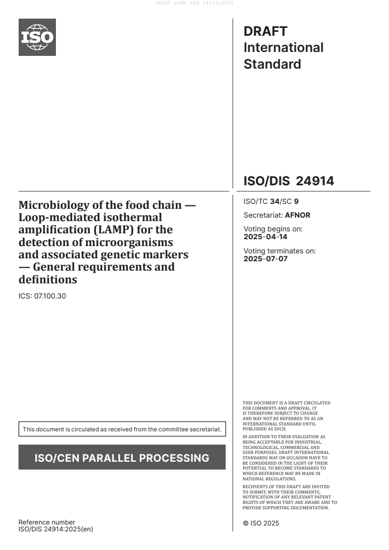 Keywords: LAMP, loop-mediated isothermal amplification, food microbiology, ISO 24914, detection of microorganisms, genetic markers, food chain, sample preparation, nucleic acid extraction, isothermal amplification, signal detection, data interpretation.
