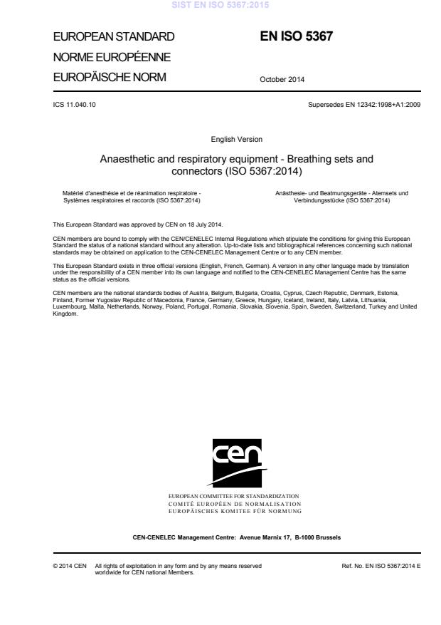 Anaesthetic and respiratory equipment - Breathing sets and connectors (ISO 5367:2014)