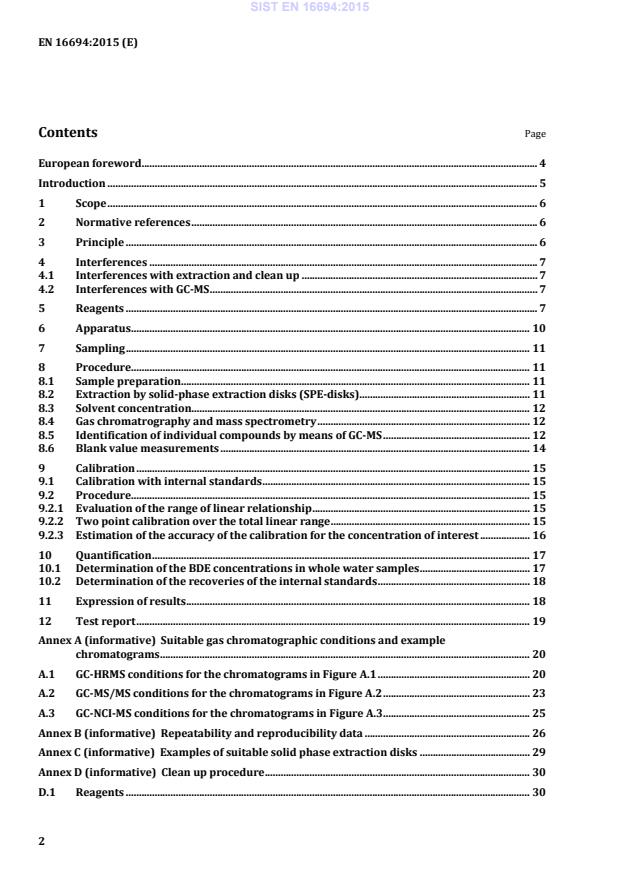 EN 16694:2015 is a standard published by the European Committee for Standardization (CEN). Its full title is "Water quality - Determination of selected polybrominated diphenly ether (PBDE) in whole water samples - Method using solid phase extraction (SPE) with SPE-disks combined with gas chromatography - mass spectrometry (GC-MS)". This standard covers: This European Standard specifies a method for the determination of six selected polybrominated diphenyl ethers (PBDEs) listed in Table 1, representative for technical BDEs in water samples in mass concentrations ≥ 0,025 ng/l (for each individual congener). (The limit of quantification (LOQ) should be determined according to ISO 13530, on the basis of replicate determinations of the procedural blank, carried out under reproducibility conditions.) The method uses solid-phase disk extraction (SPE-disk) in combination with gas chromatography-mass spectrometry (GC-MS). It is applicable to the analysis of PBDEs in surface water containing suspended particulate matter (SPM) up to 500 mg/l (whole water samples), drinking water and groundwater. This method may be used for the analysis of other BDE congeners not listed in Table 1 or other types of water. However, it is important to verify its applicability before use. (...)