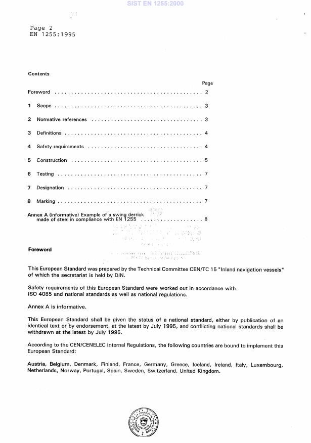 EN 1255:1995 is a standard published by the European Committee for Standardization (CEN). Its full title is "Inland navigation vessels - Swing derricks". This standard covers: This standard applies to swing derricks used on inland navigation vessels. It specifies requirements and test conditions which have to be observed for safety reasons. Swing derricks are used for transfer of crew members ashore and back to the vessel for laying out ropes during mooring and unmooring operations, particularly when the vessel is close to canal or river banks and when no other safe means of getting ashore in those cases is possible.