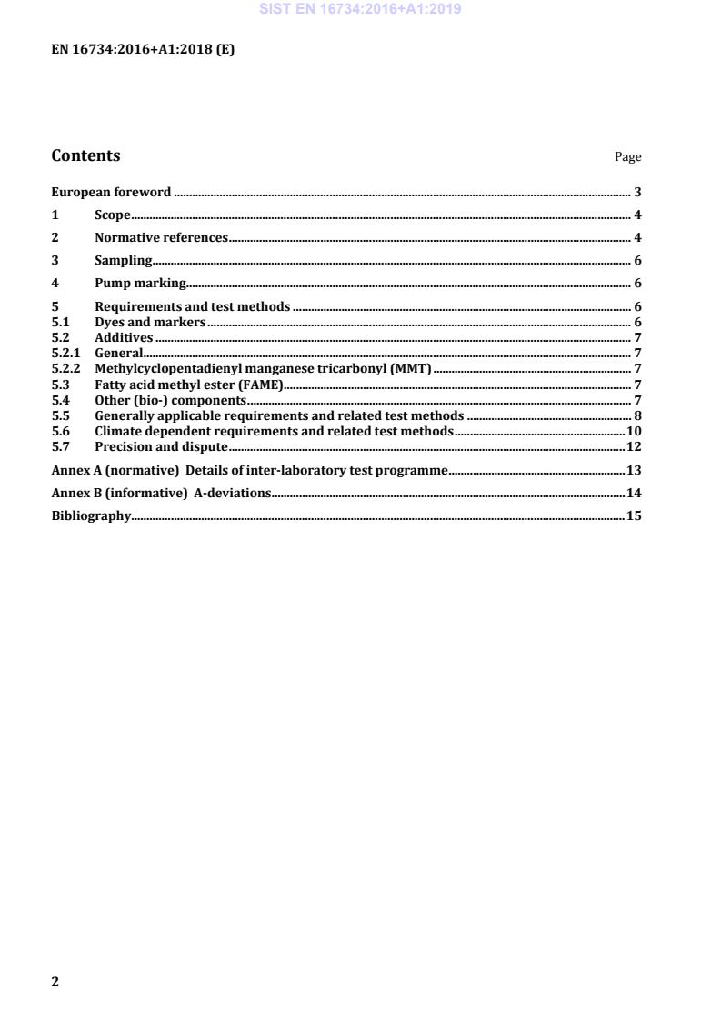 Contents Page European foreword . 3 1 Scope . 4 2 Normative references . 4 3 Sampling . 6 4 Pump marking. 6 5 Requirements and test methods . 6 5.1 Dyes and markers . 6 5.2 Additives . 7 5.2.1 General . 7 5.2.2 Methylcyclopentadienyl manganese tricarbonyl (MMT) . 7 5.3 Fatty acid methyl ester (FAME) . 7 5.4 Other (bio-) components . 7 5.5 Generally applicable requirements and related test methods . 8 5.6 Climate dependent requirements and related test methods . 10 5.7 Precision and dispute . 12 Annex A (normative)