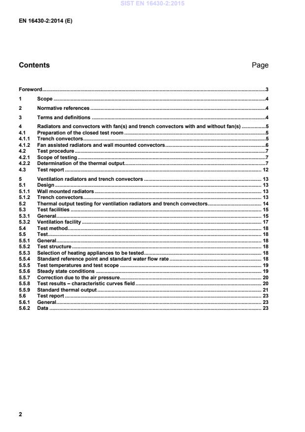 Foreword .3 1 Scope .4 2 Normative references .4 3 Terms and definitions .4 4 Radiators and convectors with fan(s) and trench convectors with and without fan(s) .5 4.1 Preparation of the closed test room .5 4.1.1 Trench convectors .5 4.1.2 Fan assisted radiators and wall mounted convectors .6 4.2 Test procedure .7 4.2.1 Scope of testing .7 4.2.2 Determination of the thermal output.7 4.3 Test report . 12 5 Ventilation radiators and trench convectors . 13 5.1 Design . 13 5.1.1 Wall mounted radiators . 13 5.1.2 Trench convectors . 13 5.2 Thermal output testing for ventilation radiators and trench convectors. 14 5.3 Test facilities . 15 5.3.1 General . 15 5.3.2 Ventilation facility . 17 5.4 Test method . 18 5.5 Test . 18 5.5.1 General . 18 5.5.2 Test structure . 18 5.5.3 Selection of heating appliances to be tested . 18 5.5.4 Standard reference point and standard water flow rate . 18 5.5.5 Test temperatures and test scope . 19 5.5.6 Steady state conditions . 19 5.5.7 Correction due to the air pressure . 20 5.5.8 Test results – characteristic curves field . 20 5.5.9 Standard thermal output . 21 5.6 Test report . 23 5.6.1 General . 23 5.6.2 Data . 23