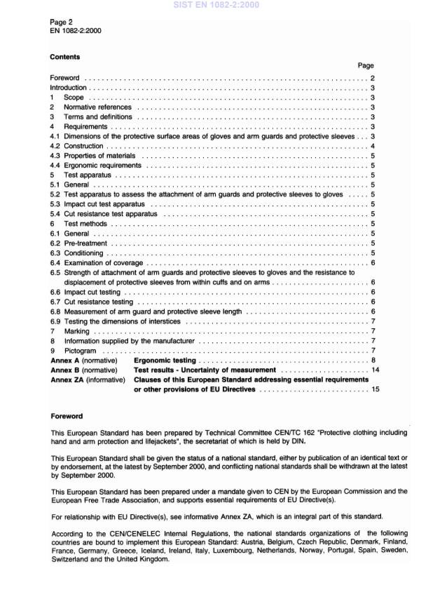 Dieser Teil 2 von EN 1082 legt Anforderungen an Gestaltung, Schnittfestigkeit, Durchstichfestigkeit und ergonomische Kenngrößen von schnittfesten Schutz- handschuhen, Armschützern und Schutzärmeln aus anderen Werkstoffen als Metallringgeflecht und steifem Metall und Kunststoff fest, die einen geringeren Schutz gegen Schnitt und Stich aufweisen als die Produkte in EN 1082-1 und die nur bei Arbeiten benutzt werden, wo das Messer nicht so spitz ist, oder es nur verwendet wird, um von der Hand und dem Arm weg zu schneiden.
