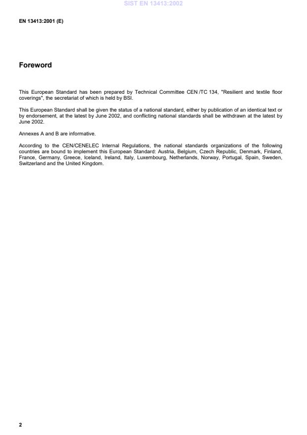 EN 13413:2001 is a standard published by the European Committee for Standardization (CEN). Its full title is "Resilient floor coverings - Polyvinyl chloride floor coverings on a filled fibrous backing - Specification". This standard covers: This European Standard specifies the characteristics of floor coverings with compact surface layers, made of polyvinyl chloride and modifications thereof, on a filled fibrous backing and supplied in roll form. To encourage the consumer to make an informed choice, the standard includes a classification system (see EN 685) based on intensity of use, which shows where these floor coverings should give satisfactory service. It also specifies requirement for marking.