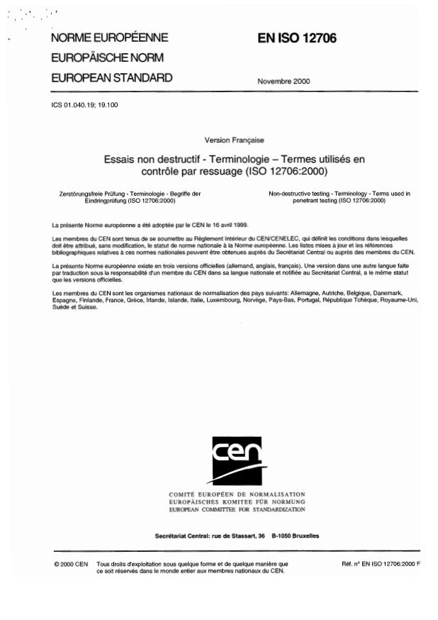EN ISO 12706:2000 is a standard published by the European Committee for Standardization (CEN). Its full title is "Non-destructive testing - Terminology - Terms used in penetrant testing (ISO 12706:2000)". This standard covers: This European standard consists of technical terms related to penetrant testing.