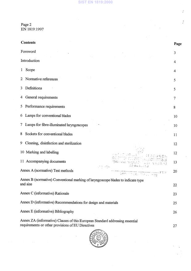 EN 1819:1997 is a standard published by the European Committee for Standardization (CEN). Its full title is "Laryngoscopes for tracheal intubation - Particular requirements". This standard covers: This standard specifies general requirements for laryngoscopes and critical dimensions for the handle and lamp of hook-on type laryngoscopes. This standard does not apply to : a) the blade form or handle design except for general requirements and the interchangeability aspects of the connection between the blade and the handle; b) the measurement and specification of the lamp illumination intensity; c) flexible laryngoscopes, or laryngoscopes designed for surgery; d) laryngoscopes powered from mains electricity supply; e) laryngoscopes connected by light-transmitting cables to external light sources; f) custom-made devices.