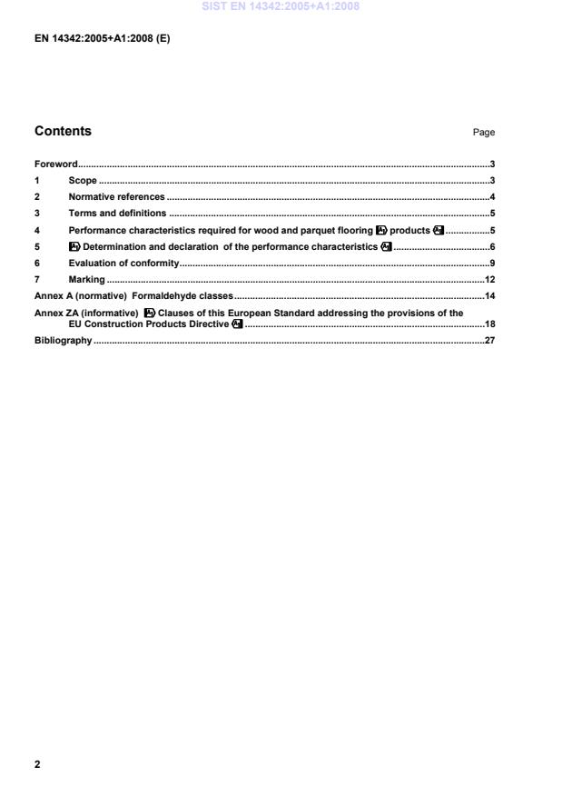 EN 844-9:1997 and those in the product standards EN 13226:2002, EN 13227:2002, EN 13228:2002, EN 13488:2002, EN 13489:2002, EN 13990:2004, EN 13629:2002, !EN 14761:2006" and EN 14354:2004 apply. !deleted text" 4 Performance characteristics required for wood and parquet flooring !!!!products"""" 4.1 General !deleted text" !The equilibrium of the moisture content in the wood and parquet flooring products depends on the surrounding" temperature and relative humidity of the site before installation and on the service conditions. Dimensional characteristics of !the wood and parquet flooring" products shall be respected in accordance with those defined in the product standard to which the product belongs. Furthermore the type of laying may limit the use of the product. Consequently, indications of use linked to the type of laying (nailed, glued, floating) !shall be indicated and linked to the type of use". NOTE !The following characteristics, mentioned in the mandate issued to CEN by the European Commission and the European Free Trade Association, under the EU Construction Products Directive (see Annex ZA), listed hereafter are not relevant to wood and parquet flooring products used for internal floorings: release of asbestos, water tightness and tactility/visibility." 4.2 List of performance characteristics required for wood and parquet flooring !!!!products"""" !The following performance characteristics of a wood or parquet flooring product shall be determined and declared, taking into account whether such characteristics are relevant for the intended use of the product, which is subject to regulatory requirements:" – reaction to fire: see 5.1; – release of formaldehyde: see 5.2; – emission of pentachlorophenol: see 5.3; – breaking strength: see 5.4 (does not apply to veneer floor coverings); SIST EN 14342:2005+A1:2008