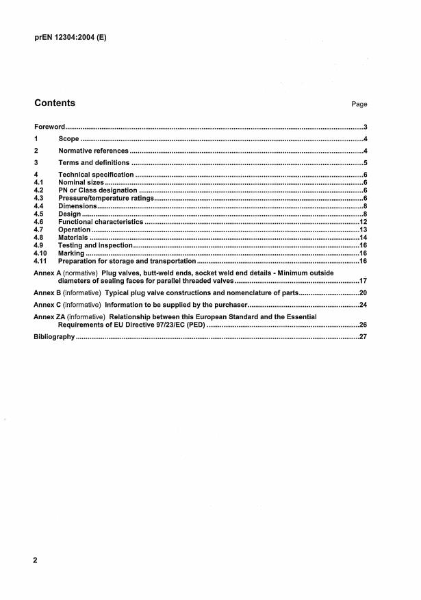 prEN 12304 is a draft published by the European Committee for Standardization (CEN). Its full title is "Industrial valves - Steel plug valves". This standard covers: This standard specifies requirements for the valve seat and body pressure/ temperature ratings and the design, including materials, dimensions, operation, performance, testing and marking of lubricated, soft seated and lined plug valves having a steel shell. It also specifies anti-static requirements, an optional fire tested design and the option of a steel or cast iron plug.