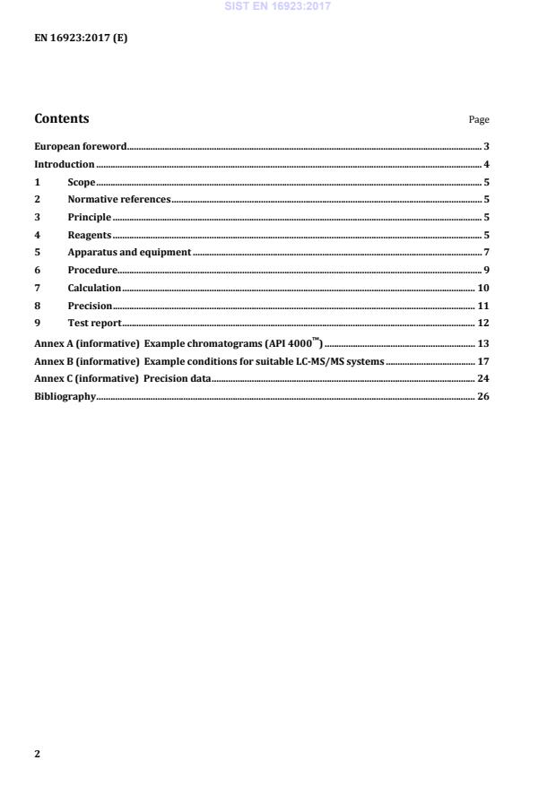 ng/ml ng/ml µl µl µl IS-Blank 0 50 – 50 950 1 5 50 10 50 940 2 10 50 20 50 930 3 20 50 40 50 910 4 40 50 80 50 870 5 60 50 120 50 830 6 80 50 160 50 790 7 100 50 200 50 750 5 Apparatus and equipment Usual laboratory apparatus and, in particular, the following. 5.1 Laboratory balance, accuracy of 0,01 g. 5.2 Analytical balance, accuracy of 0,1 mg. 5.3 Ultrasonic bath. 5.4 Laboratory shaker for test tubes. 5.5 Manual dispensers, microlitre syringes or microlitre pipettes for 10 µl to 5 ml. 5.6 Dispenser, suitable for 20 ml. 5.7 250 ml-Erlenmeyer flasks with stoppers, or 250 ml-centrifuge tubes. SIST EN 16923:2017