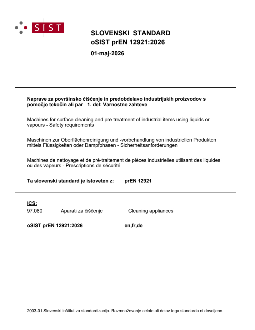 prEN 12921 is a draft published by the European Committee for Standardization (CEN). Its full title is "Machines for surface cleaning and pre-treatment of industrial items using liquids or vapours - Safety requirements". This standard covers: The EN12921-series, specifies all significant hazards, hazardous situations and hazardous events relevant to machines for surface cleaning and pre-treatment of industrial items using liquids or vapours, when they are used as intended and under the conditions foreseen by the manufacturer, including reasonably foreseeable misuse. It is proposed to merge the EN12921-series into one standard. This future standard should only deal with processes which are allowed in the European Union. Thus machines for processes with halogenated solvents would not be covered anymore.