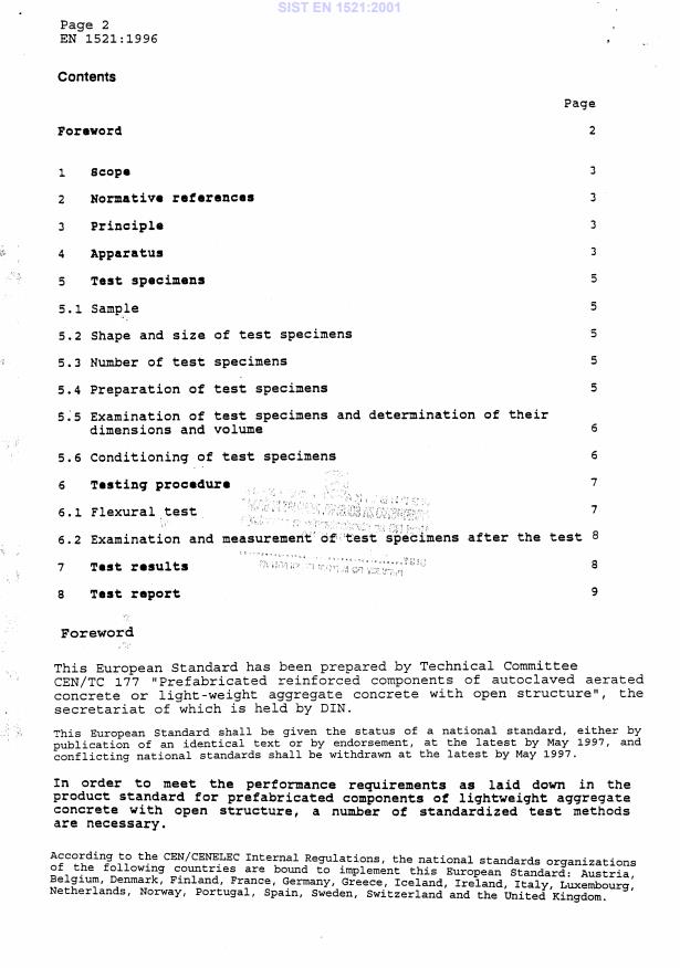 EN 1521:1996 is a standard published by the European Committee for Standardization (CEN). Its full title is "Determination of flexural strength of lightweight aggregate concrete with open structure". This standard covers: This European standard specifies a method of determining the flexural (tensile) strength of lightweight aggregate concrete with open structure (LAC) according to prEN 1520 by means of prismatic test specimens taken from prefabricated components.