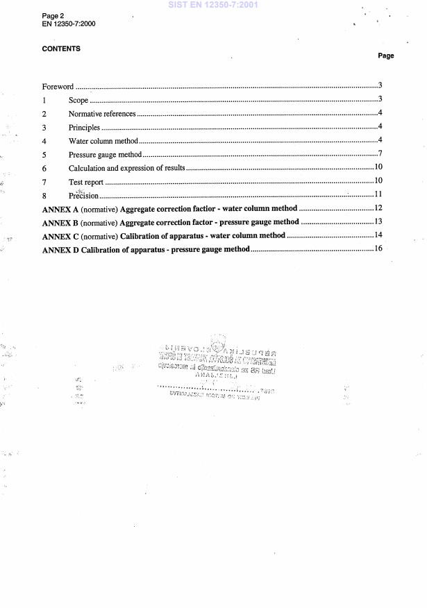 EN 12350-7:2000 is a standard published by the European Committee for Standardization (CEN). Its full title is "Testing fresh concrete - Part 7: Air content - Pressure methods". This standard covers: This standard describes two methods for determination of air content of compacted fresh concrete, made with normal weight or relatively dense aggregate of maximum size 63 mm.
