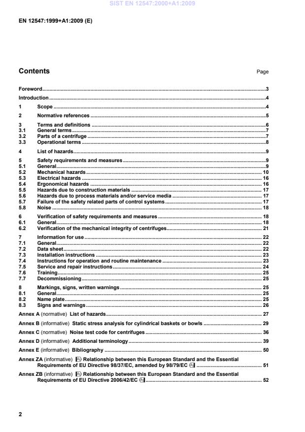 EN 12547:1999+A1:2009 is a standard published by the European Committee for Standardization (CEN). Its full title is "Centrifuges - Common safety requirements". This standard covers: 1.1 This European Standard applies to centrifuges aiming at separation of liquid/liquid/solid/solid or at least two of these substances. It gives requirements to minimise the risks caused by the hazards specified in 1.2. The Standard deals with the significant hazards associated with the operation of centrifuges. 1.2 The Standard gives requirements for minimising the risks caused by the following hazards: - mechanical hazards common to all types of centrifuges, except those specified in 1.3; - ergonomical hazards; - electrical hazards. The standard also covers requirements for noise measurements. 1.3 Types of centrifuges and hazards excluded 1.3.1 Types of centrifuges excluded: - centrifuges with a kinetic energy of rotation less than 200 Joule; - centrifuges designated by their manufacturers for domestic use; - centrifuges designated by their manufacturers as laboratory centrifuges according to EN 61010-2-020, including Amendment 1; - centrifuges designated by their manufacturers for forming, i.e. centrifugal hot metal casting machines. 1.3.2 Hazards excluded: - thermal hazards; - hazards specific to processing radioactive products; - hazards specific to microbiological processing - including viral and parasitic hazards; - hazards from processing corrosive and/or erosive materials; - hazards from processes involving flammable or explosive substances; - hazards caused by leakage of hazardous substances; - hazards caused by unsuitable hygienic design for applications involving food products; - other application specific hazards which must be dealt with, either according to application specific standards (e.g. prEN 12505), or EN 292. 1.4 This standard applies to centrifuges which are manufactured after the date of issue of this standard.