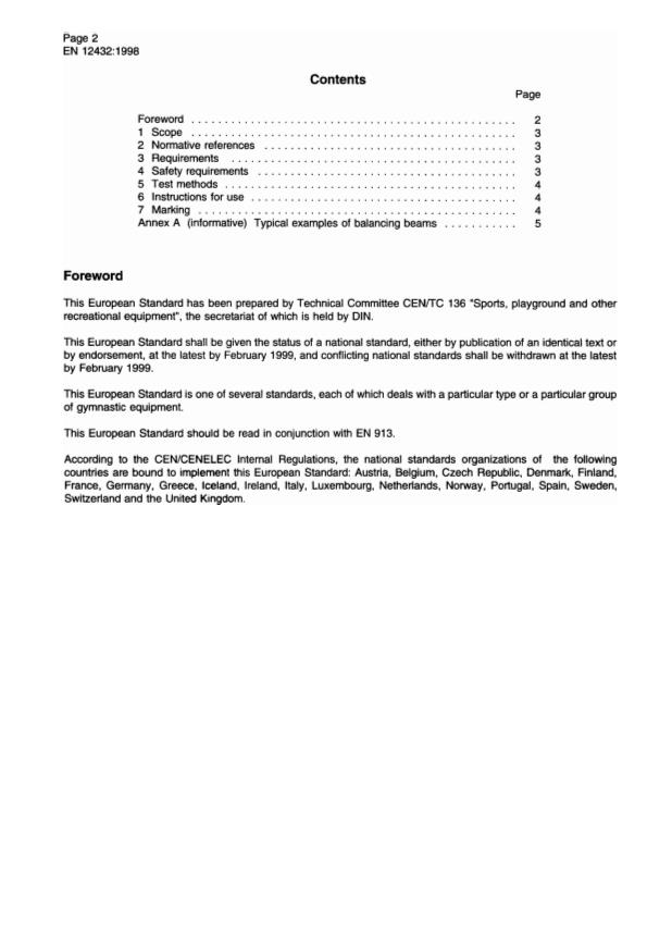 EN 12432:1998 is a CEN standard for gymnastic equipment - balancing beams, establishing the functional and safety requirements plus associated test methods. The standard specifies the functional requirements (see Clause 3) and the specific safety requirements for free‑standing balancing beams in addition to the general safety requirements contained in EN 913 (see Clause 4). EN 12432 was later adopted as a national standard (e.g., SIST EN 12432:2002 in Slovenia). ICS classification: 97.220.30 (sports equipment).