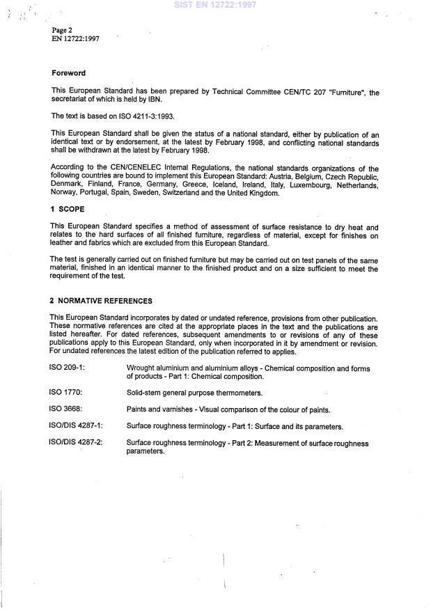 INTERNATIONAL STANDARD ISO 4211-3 First edition 1993-12-01 Furniture - Tests for surfaces - Part 3: Assessment of resistance to dry heat Ameublemen t - Essais des finitions de surface - Partie 3: lkaluation de Ia ksistance 3 Ia chaleur Seche Reference number ISO 4211-3:1993(E) SIST EN 12722:1997