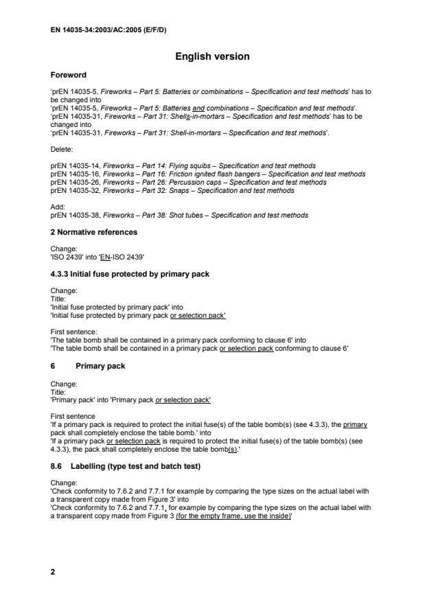 EN 14035-34:2003/AC:2005 is a corrigendum published by the European Committee for Standardization (CEN). Its full title is "Fireworks - Part 34: Table bombs - Specification and test methods". This standard covers: TC - Update of list in foreword, normative ref., 4.3.3, Clause 6, 8.3.2.4, etc.