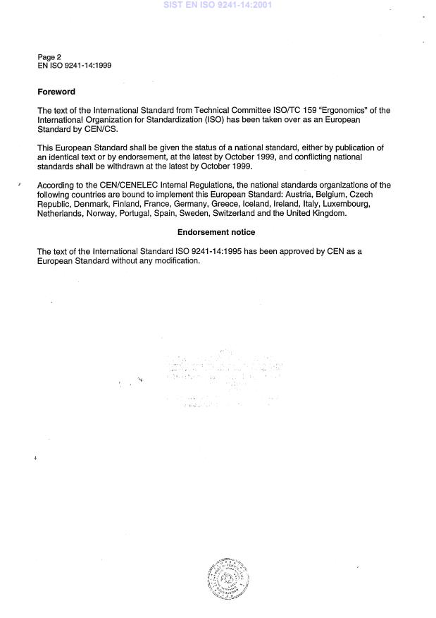 EN ISO 9241-14:1999 is a standard published by the European Committee for Standardization (CEN). Its full title is "Ergonomic requirements for office work with visual display terminals (VDTs) - Part 14: Menu dialogues (ISO 9241-14:1995)". This standard covers: Migrated from Progress Sheet (TC Comment) (2000-07-10): Following BT 125/1992, this part of ISO 9241 will undergo a parallel CEN/ISO ++ voting procedure.