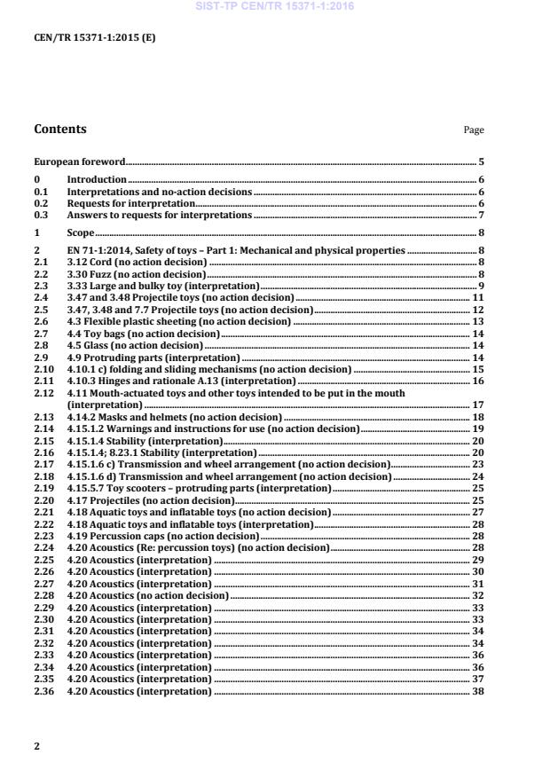 The purpose of this Technical Report is to provide replies to requests for interpretations of EN 71-1:2014, Safety of toys - Part 1: Mechanical and physical properties, EN 71-2:2011+A1:2014, Safety of toys - Part 2: Flammability, EN 71-8:2011, Safety of toys - Part 8: Activity toys for domestic use and EN 71-14:2014, Safety of toys - Part 14: Trampolines for domestic use.